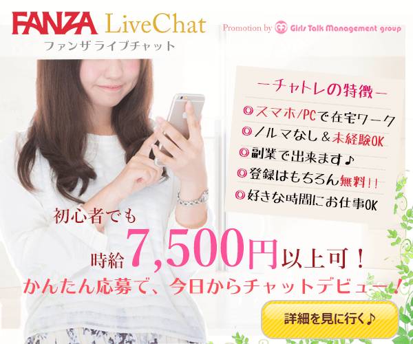 自分の好きなタイミングで稼げるFANZAの在宅チャットレディ! ノンアダルトだから安心!スマホでかんたん在宅ワーク 時給7,500円以上可、安心の個人情報対策、最短翌日振込! |